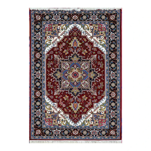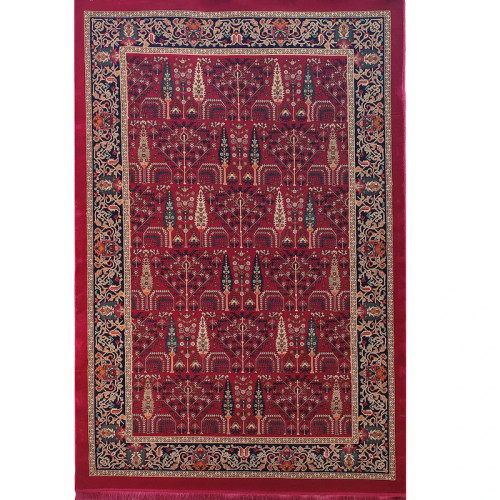فرش ماشینی 700 شانه فرش هیوا زمینه قرمز لاکی حاشیه سرمه ای مدل اناری